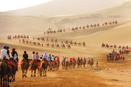 5月19日,游客在甘肅省敦煌市鳴沙山月牙泉景區(qū)游覽。
