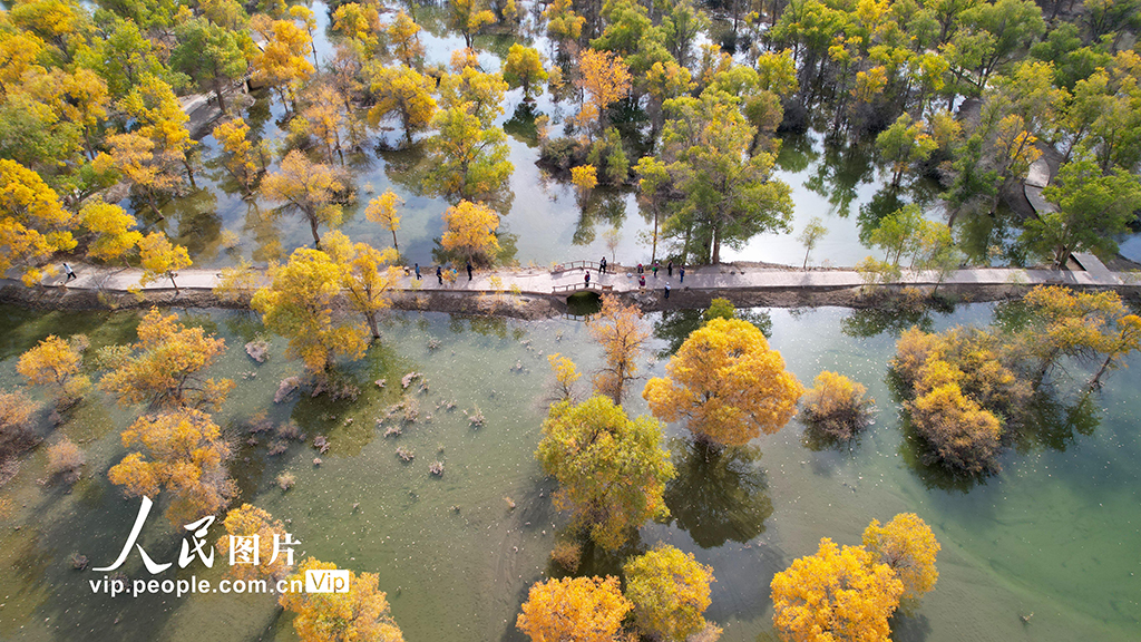 2024年9月27日,甘肅省酒泉市金塔沙漠胡楊林景區(qū)萬(wàn)畝生態(tài)胡楊林層林盡染,景美如畫。曹紅祖攝(人民圖片網(wǎng))