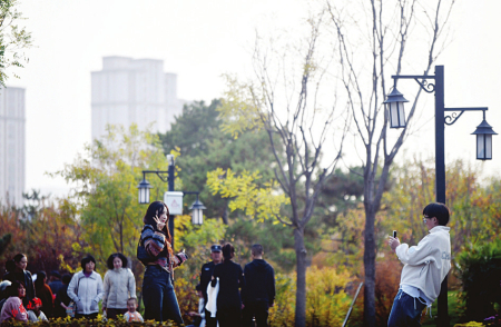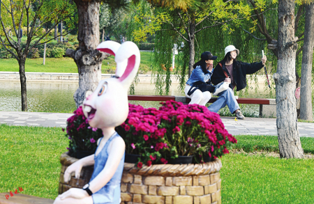 7.游客在花境微景觀中休息、打卡。