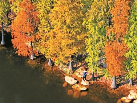隨著天氣轉冷,廣西南寧市多個公園的杉樹樹葉愈發(fā)紅艷,分外靚麗。圖為12月21日,市民在廣西南寧市青秀山風景區(qū)的杉樹林里游玩。 新華社記者 周華攝