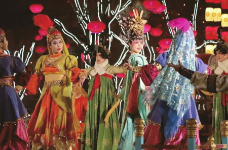 有才華的游客可以在《盛唐密盒》處舉手示意,與演員互動;喜歡李白的游客可以在《詩歌藝術(shù)》處與李白 對詩;《花車 斗彩》處西域胡姬與大唐美女現(xiàn)場斗舞,彰顯盛唐時期絲路文化和盛唐文化的和諧交融,仿佛到了古裝電視劇中的上元節(jié);《貞觀之治》處則可感受李世民時期萬國來朝賀的盛世景象;一路有行為藝術(shù),《武士雕刻》《奮斗在路上》《畫中人》《戲演壁畫》等讓人目不暇接,一路走走停停,到達(dá)最南端的開元廣場,就可以看一場大唐不夜城場地最大、演員最多、時間最長的表演《再回長安》,感受大詩人白居易回長安的盛大氛圍;開元廣場東側(cè)不倒翁小姐姐表演,周圍也圍著很多游客,不遠(yuǎn)萬里前來一睹小姐姐美麗的身姿。