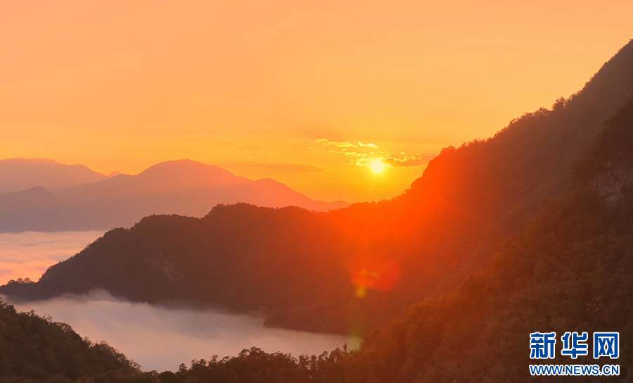 曙光初照,云海翻騰。近日,安徽省池州市石臺縣仙寓山景區(qū)在晨光中展現(xiàn)出一幅壯麗的日出云海畫卷。萬頃云濤在層巒疊嶂間奔涌流動,與朝霞金光交織成景,氣象萬千,蔚為壯觀。(王帆 攝)