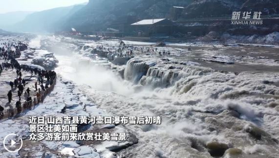 近日,山西吉縣黃河壺口瀑布雪后初晴,景區(qū)壯美如畫,眾多游客前來欣賞壯美雪景。從空中俯瞰,瀑布仿佛披上了一層潔白的輕紗,黃河水夾雜著流凌從上游呼嘯而下,跌入十里龍槽,激起陣陣白色水霧,經(jīng)陽光折射后,一道美麗的彩虹若隱若現(xiàn),美不勝收。
