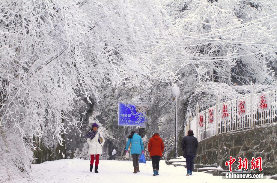 3月10日,受寒潮影響,江西廬山降下2016年入春首場大雪,和霧凇景觀同現。紅色的廬山老別墅房頂,在銀裝素裹的山中格外顯眼。一眼望去,分外妖嬈的廬山猶如仙境畫卷。圖為一眼望去,銀裝素裹分外妖嬈的廬山猶如仙境畫卷。 吳健 攝