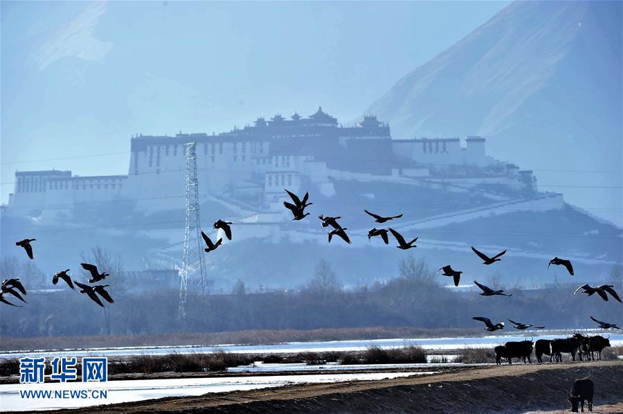 水鳥飛翔在拉魯濕地上空(1月7日攝)。入冬以來,位于拉薩城邊的拉魯濕地國家級(jí)自然保護(hù)區(qū)候鳥增多,斑頭雁、赤麻鴨、野鴨等數(shù)十種候鳥在這里過冬。拉魯濕地國家級(jí)自然保護(hù)區(qū)海拔3600多米,總面積12.64平方公里,是中國海拔最高、面積最大的城市天然濕地,被譽(yù)為“拉薩之肺”。新華社記者 張汝鋒 攝
