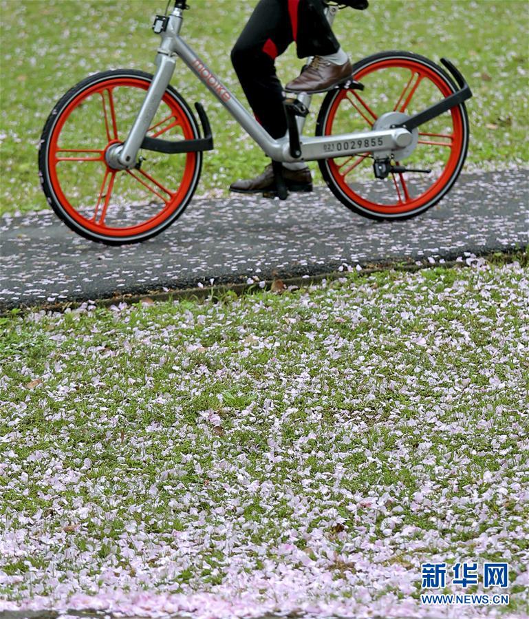4月17日,一場春雨過后,蘇州市民騎車經(jīng)過落滿櫻花的盛家?guī)?。新華社發(fā)(王建中 攝)