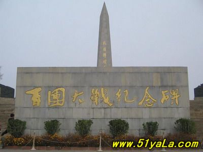 “百團大戰(zhàn)紀(jì)念碑”座北朝南,由主碑、三座副碑、一座大型圓雕、兩座題字碑、四個烽火臺和長 227米蜿蜒起伏的長城組成,于1987年6月30日建成。