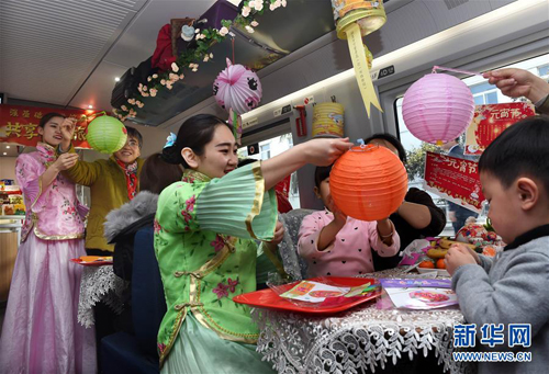 3月1日,在青島開(kāi)往北京南的G184次列車(chē)上,青島高鐵餐飲公司的工作人員和旅客一起制作花燈。新華社記者 李紫恒 攝