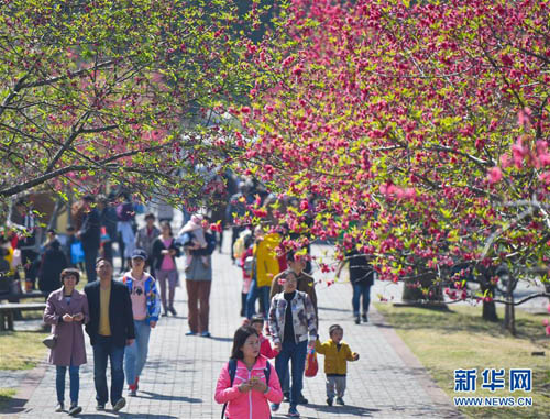 3月11日,游人在福建農(nóng)林大學(xué)校內(nèi)賞花。 新華社記者 宋為偉 攝