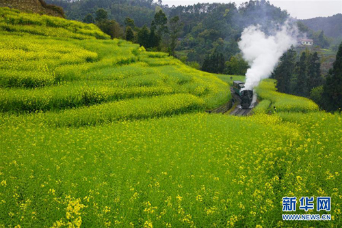 3月19日,一輛小火車從樂山市嘉陽(yáng)鎮(zhèn)的油菜花田中駛過。早春時(shí)節(jié),四川省樂山市嘉陽(yáng)鎮(zhèn)的油菜花競(jìng)相綻放,一派春意盎然的景象。 新華社發(fā)(張偉 攝)