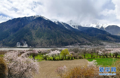 這是山腳下的桃花林景色(3月31日攝)。日前,西藏林芝市波密縣的桃花相繼綻放,奇美景色令人流連忘返。新華社記者 張汝鋒 攝