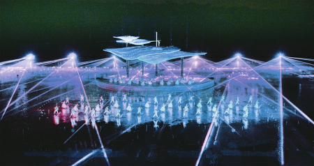 在這場(chǎng)演出中,最令人驚嘆的當(dāng)數(shù)傳統(tǒng)文化與現(xiàn)代科技的完美融合。《如夢(mèng)晉陽(yáng)》演出設(shè)備島造型由大量不銹鋼鋼管經(jīng)過(guò)設(shè)計(jì)、再加工拼接而成,整體形成“山”的造型,好似坐落于湖中心的小島。面積高達(dá)182米×82米的全水下噴泉矩陣、2000多束璀璨燈光,配合前方的直流、對(duì)拱、扇形水幕,連同后方80米×19米網(wǎng)幕形成的視覺(jué)矩陣投影,展現(xiàn)出宏大的山景古城畫面。這些畫面栩栩如生,將晉陽(yáng)古城的歷史變遷、文化傳承一一展現(xiàn)在觀眾眼前,讓人仿佛置身于歷史的長(zhǎng)河之中,親身感受著晉陽(yáng)的興衰榮辱。