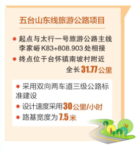 五臺山東線旅游公路起點與太行一號旅游公路主線李家峪K83+ 808.903處相接,終點位于臺懷鎮(zhèn)南坡村附近,全長31.77公里,采用雙向兩車道三級公路標準建設(shè),設(shè)計速度采用30公里/小時,路基寬度為7.5米。項目實施圍繞“扶貧、旅游、生態(tài)、人文、研學(xué)”等核心宗旨,著力提升五臺山風(fēng)景名勝區(qū)旅游公路的通行能力與服務(wù)水平,強化“交通+旅游”與“經(jīng)濟增長”的導(dǎo)向作用。