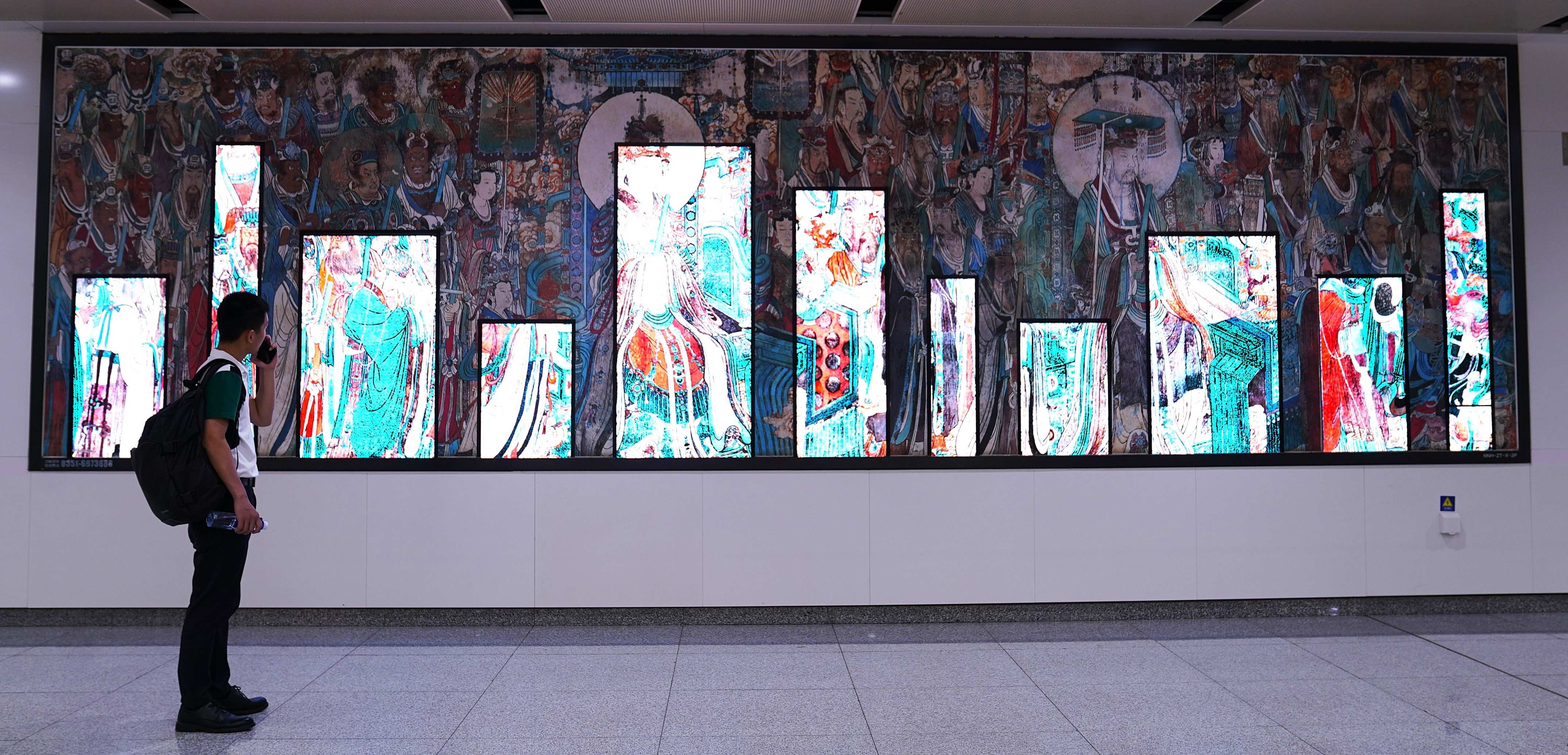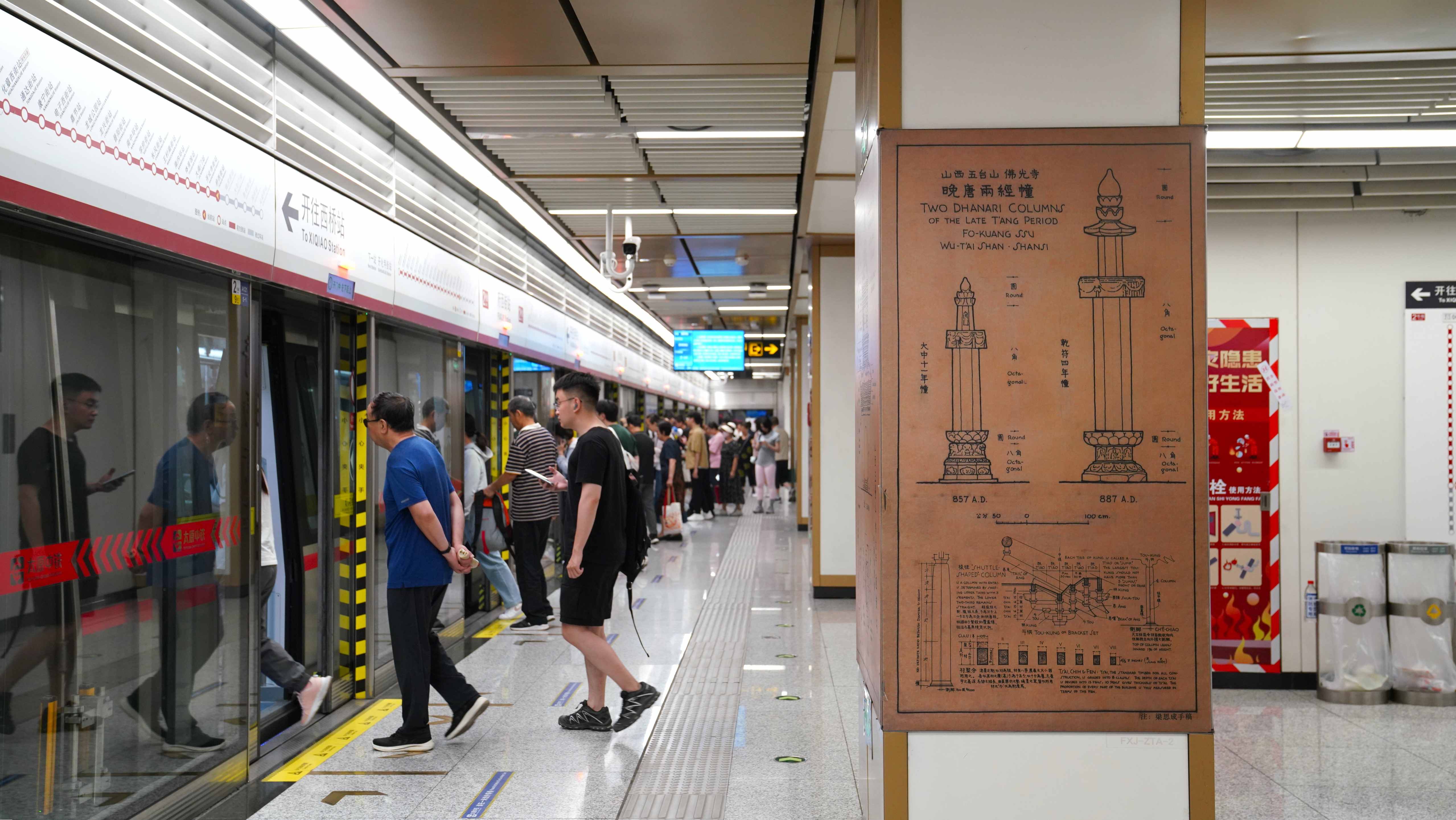 連永樂宮壁畫的絢麗、云岡石窟大佛的莊嚴(yán)、應(yīng)縣木塔的精巧,都被藝術(shù)復(fù)刻在站廳里——等車的間隙,有人會(huì)盯著壁畫上的飛天出神,有人會(huì)摸著梁思成筆下的古塔紋路發(fā)呆,匆忙的通勤路,忽然就多了份文化的滋養(yǎng)。
