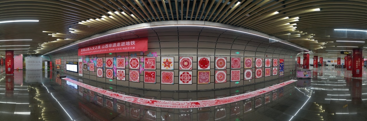國(guó)家級(jí)非物質(zhì)文化遺產(chǎn)代表性項(xiàng)目太原剪紙?jiān)谔罔F2號(hào)線長(zhǎng)風(fēng)街站展示。井宇豪 攝