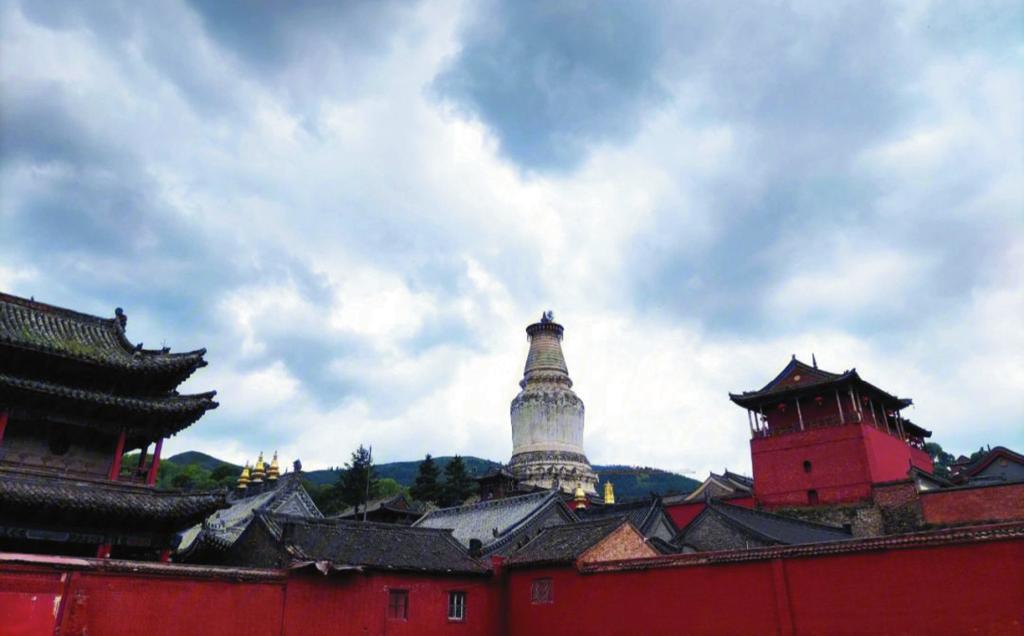 五臺山最具代表性的鈴聲就是從塔院寺高聳入云的大白塔上傳出的風(fēng)鈴聲。大白塔環(huán)周83.8米,通高75.3米,塔高56.4米,比北京北海白塔還高20.5米,比代縣阿育王塔高16.5米,是元大德五年(1301年)由尼泊爾匠師阿尼哥設(shè)計建造的尼泊爾式大塔,也是我國現(xiàn)存元代最高的覆缽式塔建筑。大白塔基座呈東、西、南、北、東南、東北、西南、西北八角形,塔身上面13層,呈由粗及細的輪狀造型,稱“十三天”,又名“十三相輪”?!笆臁鄙厦嫔w著8塊銅板,按乾、坎、艮、震、巽、離、坤、兌八卦位置安裝,周長23.1米,檐邊吊裝銅質(zhì)垂檐36塊,共安裝風(fēng)鈴108個,連同束腰風(fēng)鈴共252個。塔頂裝有高5.4米的鍍金寶瓶。整座白塔形如藻瓶,上下比例協(xié)調(diào),造型別致典雅。每當風(fēng)吹鈴響,風(fēng)鐸鳴四端,悠然成風(fēng)韻,讓人油然而生崇敬之感。