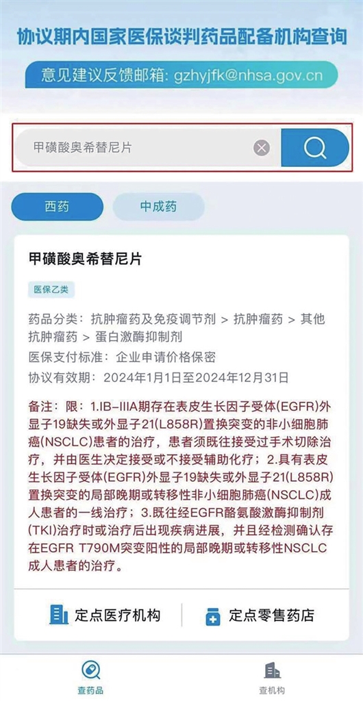 第二步:輸入“國談藥”名稱,點擊搜索,可看到醫(yī)保支付標準、協(xié)議有效期等信息。