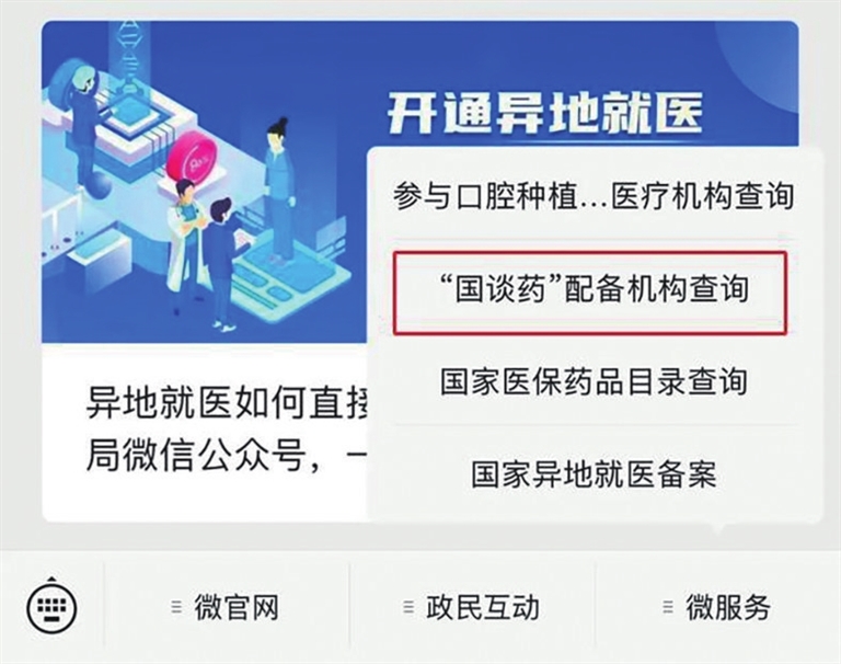 第一步:進入“國家醫(yī)保局”微信公眾號,點擊微服務(wù)→“國談藥”配備機構(gòu)查詢,進入查詢頁面。