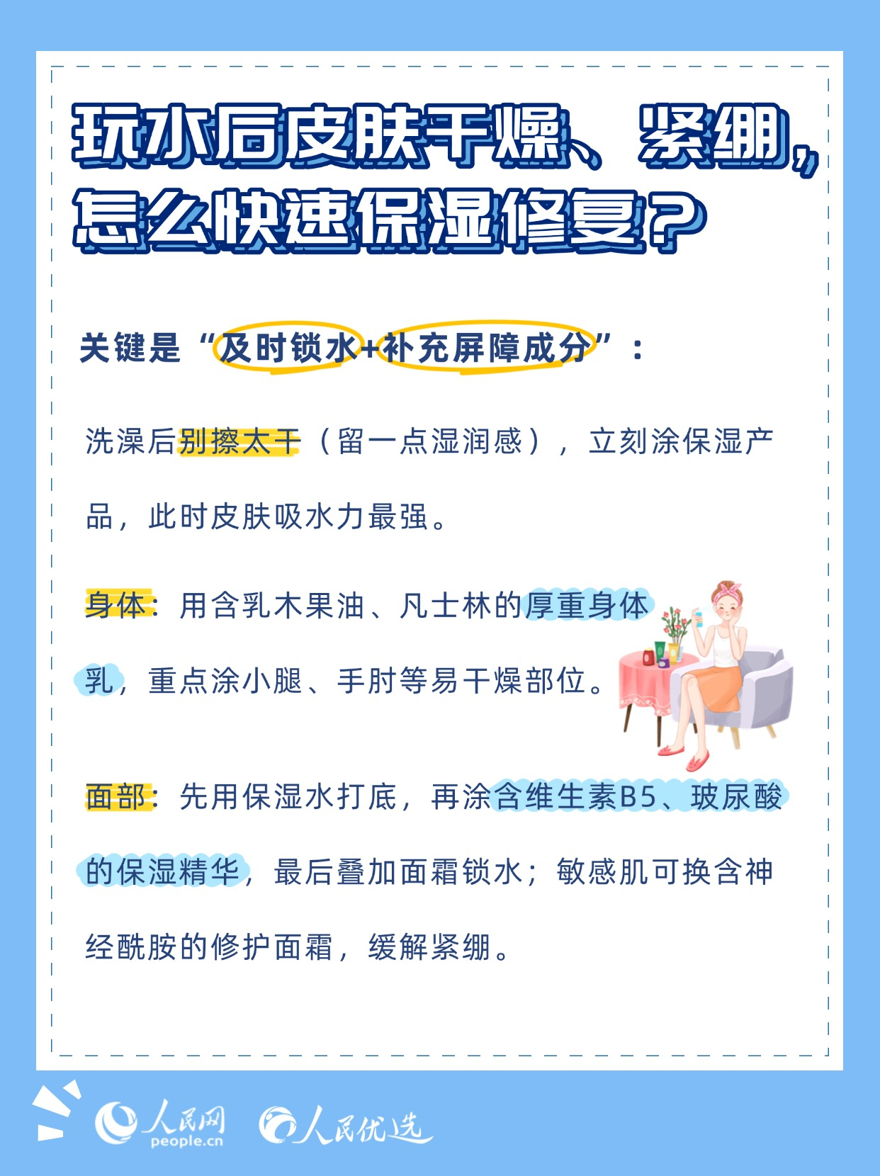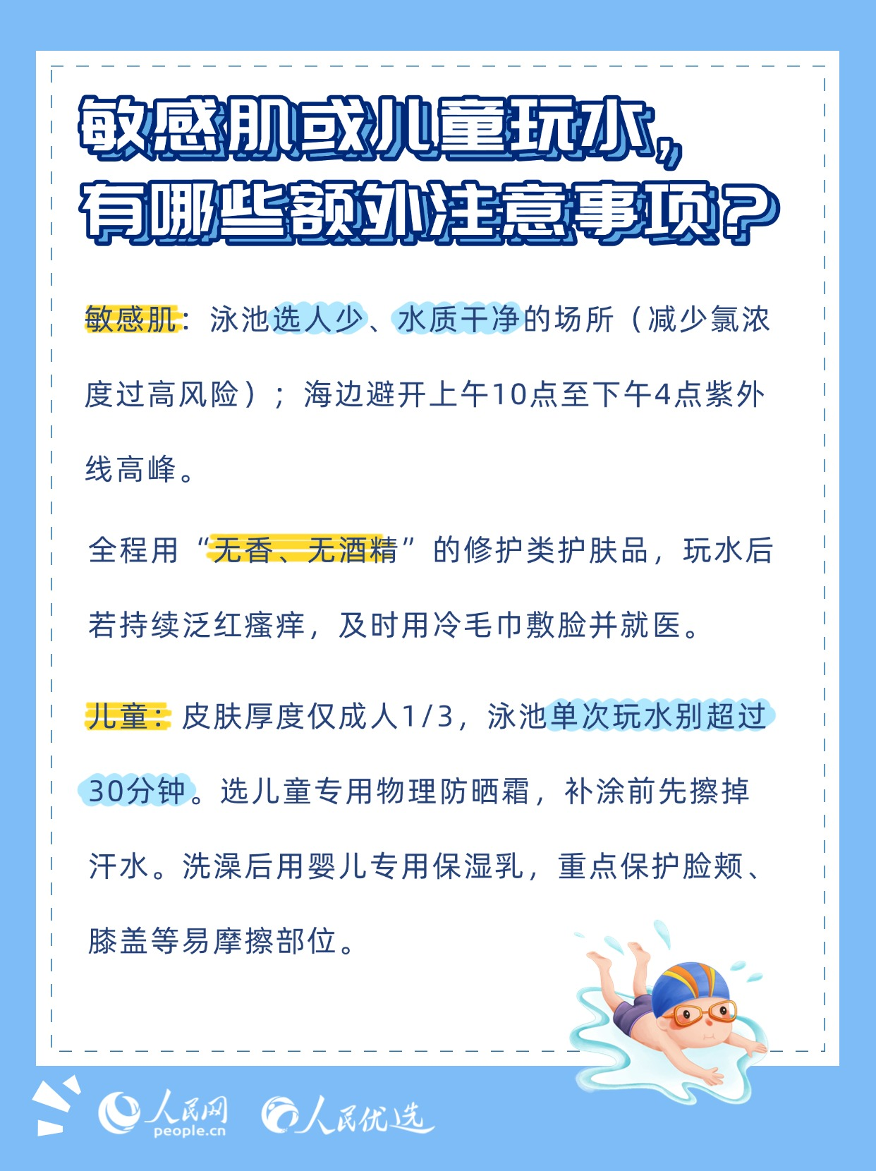 夏日炎炎,無論是泳池里的清涼暢游,還是海邊的逐浪嬉戲,都是驅(qū)散暑氣的不錯選擇。但玩水的快樂背后,卻藏著不少傷害皮膚的“陷阱”——泳池的消毒劑、海邊的強(qiáng)紫外線、海水中的高鹽分,稍有不慎就可能引發(fā)皮膚干燥、泛紅、曬黑、長斑甚至?xí)駛?。本期《人民?yōu)選來了》教你掌握科學(xué)的護(hù)膚方法,讓你在享受玩水樂趣的同時,保持健康的肌膚狀態(tài)。