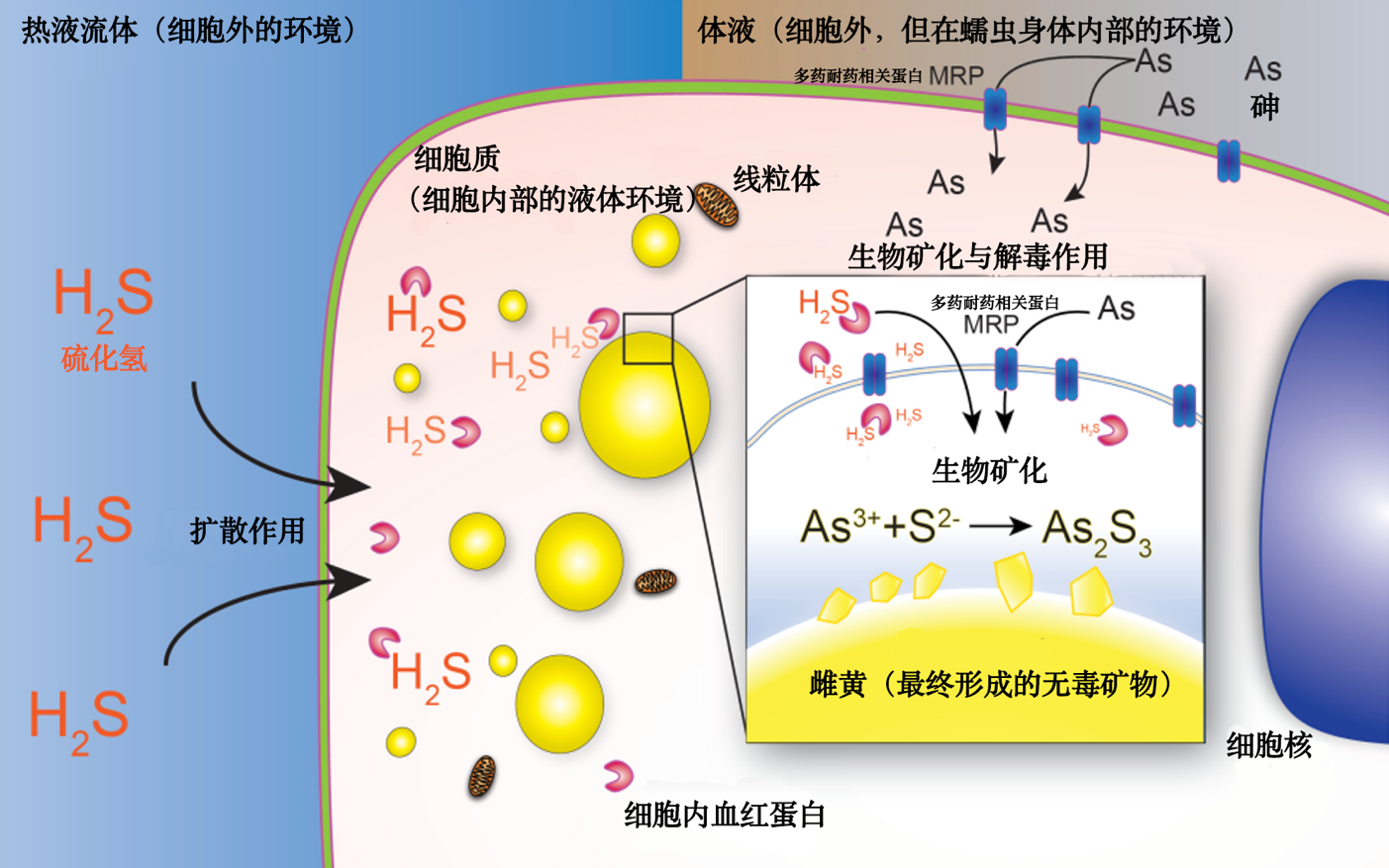 至此,兩種致命的毒物在“與世隔絕”的囊泡“反應(yīng)倉”內(nèi)相遇了。在這個(gè)由雙層脂質(zhì)膜包裹的封閉空間里,環(huán)境被細(xì)胞精確調(diào)控:這里是還原性的、低溫的,且pH值接近中性。這些條件恰好是促進(jìn)砷和硫化氫發(fā)生化學(xué)反應(yīng),形成穩(wěn)定、不溶于水的雌黃晶體的最佳環(huán)境。于是,兩種液態(tài)的、高活性、高毒性的物質(zhì),就此結(jié)合成了一種固態(tài)的、惰性的、相對無害的礦物。毒性被永久地“鎖定”在了晶體結(jié)構(gòu)中。