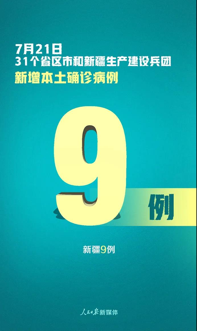7月21日0—24時,31個?。ㄗ灾螀^(qū)、直轄市)和新疆生產(chǎn)建設(shè)兵團報告新增確診病例14例,其中境外輸入病例5例(上海2例,廣東2例,云南1例),本土病例9例(均在新疆);無新增死亡病例;無新增疑似病例。