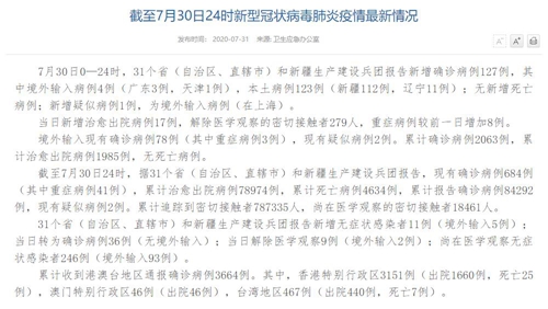 情況顯示,截至7月30日24時,據(jù)31個?。ㄗ灾螀^(qū)、直轄市)和新疆生產建設兵團報告,現(xiàn)有確診病例684例(其中重癥病例41例),累計治愈出院病例78974例,累計死亡病例4634例,累計報告確診病例84292例,現(xiàn)有疑似病例2例。累計追蹤到密切接觸者787335人,尚在醫(yī)學觀察的密切接觸者18461人。