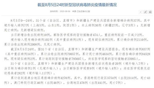 人民網北京8月6日電(董童)國家衛(wèi)生健康委于今日在官網發(fā)布的《截至8月5日24時新型冠狀病毒肺炎疫情最新情況》(以下簡稱“情況”)提出,8月5日0—24時,31個?。ㄗ灾螀^(qū)、直轄市)和新疆生產建設兵團報告新增確診病例37例,其中境外輸入病例7例(上海5例,山東1例,陜西1例),本土病例30例(新疆27例,遼寧3例);無新增死亡病例;無新增疑似病例。當日新增治愈出院病例10例,解除醫(yī)學觀察的密切接觸者474人,重癥病例較前一日減少2例。