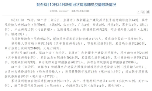 情況顯示,截至8月10日24時(shí),據(jù)31個(gè)省(自治區(qū)、直轄市)和新疆生產(chǎn)建設(shè)兵團(tuán)報(bào)告,現(xiàn)有確診病例794例(其中重癥病例44例),累計(jì)治愈出院病例79284例,累計(jì)死亡病例4634例,累計(jì)報(bào)告確診病例84712例,現(xiàn)有疑似病例3例。累計(jì)追蹤到密切接觸者802273人,尚在醫(yī)學(xué)觀察的密切接觸者23790人。