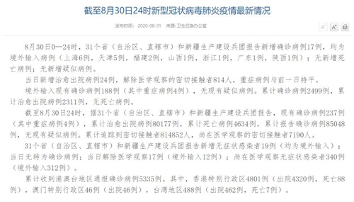 情況顯示,截至8月30日24時(shí),據(jù)31個(gè)?。ㄗ灾螀^(qū)、直轄市)和新疆生產(chǎn)建設(shè)兵團(tuán)報(bào)告,現(xiàn)有確診病例237例(其中重癥病例4例),累計(jì)治愈出院病例80177例,累計(jì)死亡病例4634例,累計(jì)報(bào)告確診病例85048例,無現(xiàn)有疑似病例。累計(jì)追蹤到密切接觸者814852人,尚在醫(yī)學(xué)觀察的密切接觸者7190人。