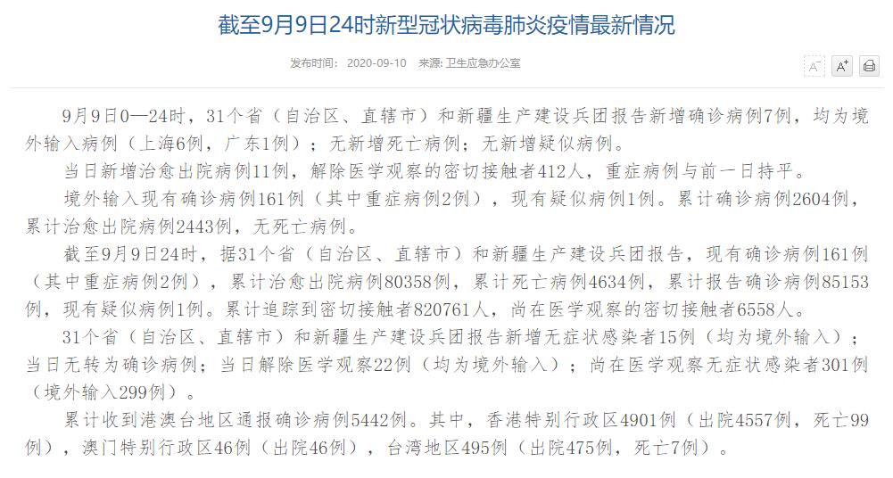情況顯示,截至9月9日24時(shí),據(jù)31個(gè)?。ㄗ灾螀^(qū)、直轄市)和新疆生產(chǎn)建設(shè)兵團(tuán)報(bào)告,現(xiàn)有確診病例161例(其中重癥病例2例),累計(jì)治愈出院病例80358例,累計(jì)死亡病例4634例,累計(jì)報(bào)告確診病例85153例,現(xiàn)有疑似病例1例。累計(jì)追蹤到密切接觸者820761人,尚在醫(yī)學(xué)觀察的密切接觸者6558人。