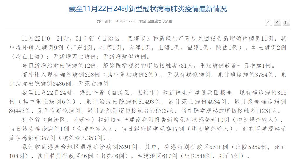 人民網(wǎng)北京11月23日電(董童)國家衛(wèi)生健康委于今日在官網(wǎng)發(fā)布的《截至11月22日24時新型冠狀病毒肺炎疫情最新情況》(以下簡稱“情況”)指出,11月22日0—24時,31個?。ㄗ灾螀^(qū)、直轄市)和新疆生產(chǎn)建設兵團報告新增確診病例11例,其中境外輸入病例9例(廣東4例,北京1例,天津1例,上海1例,福建1例,陜西1例),本土病例2例(均在上海);無新增死亡病例;無新增疑似病例。當日新增治愈出院病例12例,解除醫(yī)學觀察的密切接觸者731人,重癥病例較前一日增加1例。