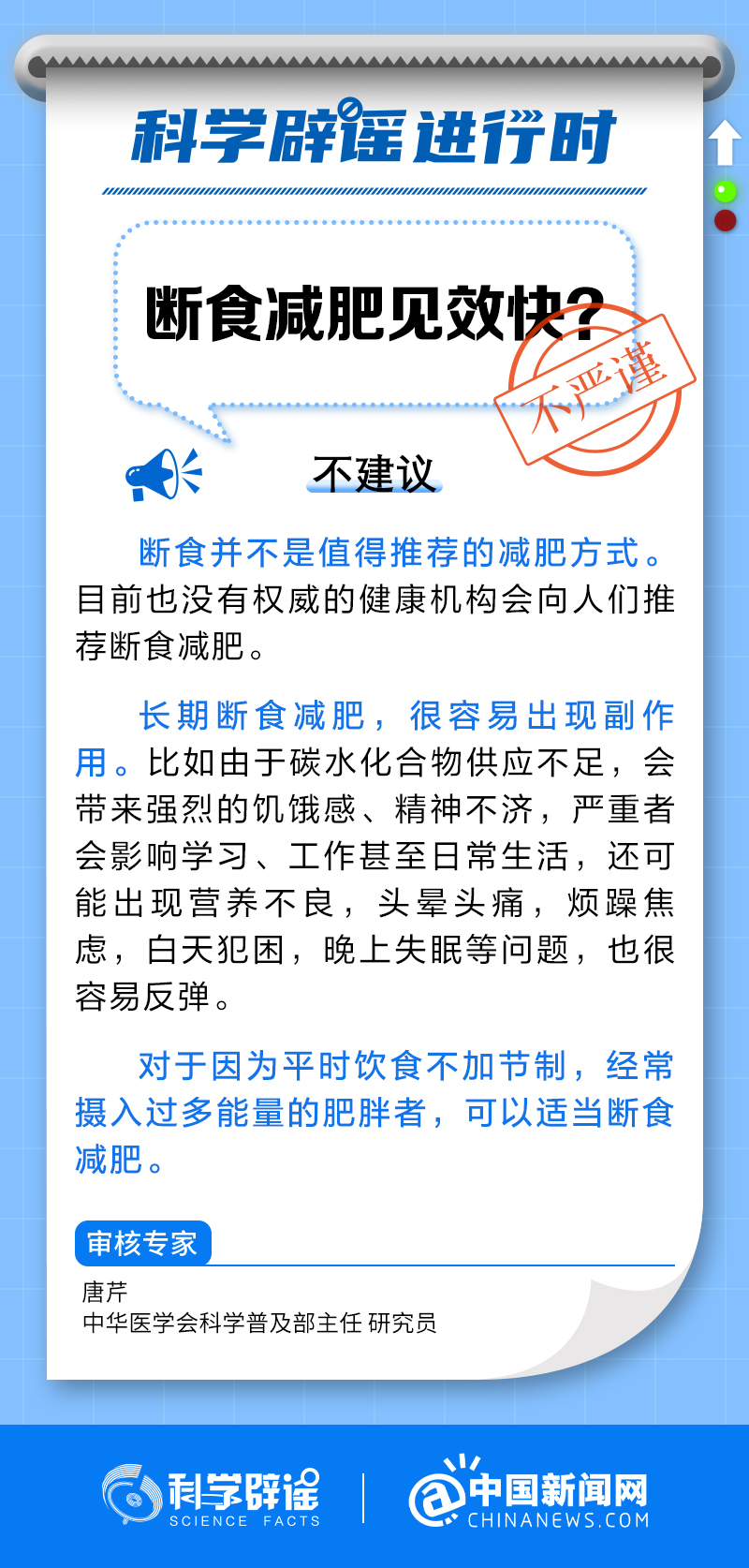 中新網(wǎng)12月26日電 斷食并不是值得推薦的減肥方式。目前也沒有權(quán)威的健康機(jī)構(gòu)會(huì)向人們推薦斷食減肥。長(zhǎng)期斷食減肥,很容易出現(xiàn)多種副作用。(來源:@科學(xué)辟謠 中國(guó)新聞網(wǎng)微博)