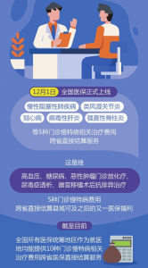 記者從國家醫(yī)保局了解到,12月1日,全國醫(yī)保正式上線慢性阻塞性肺疾病、類風(fēng)濕關(guān)節(jié)炎、冠心病、病毒性肝炎、強(qiáng)直性脊柱炎等5種門診慢特病相關(guān)治療費用跨省直接結(jié)算服務(wù)。