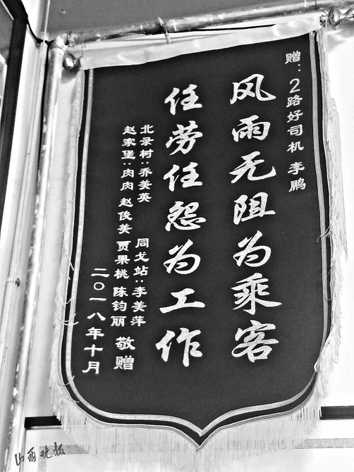 撿到東西歸還失主,失主送來表揚(yáng)信比較常見,山西晚報(bào)記者發(fā)現(xiàn)有一張比較例外。一位署名“2路乘客”的感謝信中這樣寫道:“2017年以前,可以說偶爾坐2路,因?yàn)榻?jīng)常會(huì)有等不上車的情況。但自從李鵬接上2路以后,基本上沒出現(xiàn)過等不上車的情況……作為長期乘坐公交的乘客真心非常感謝……”錦旗是7名乘客集體送的,“風(fēng)雨無阻為乘客,任勞任怨為工作”,14個(gè)字,表達(dá)的是乘客對(duì)李鵬的認(rèn)可。