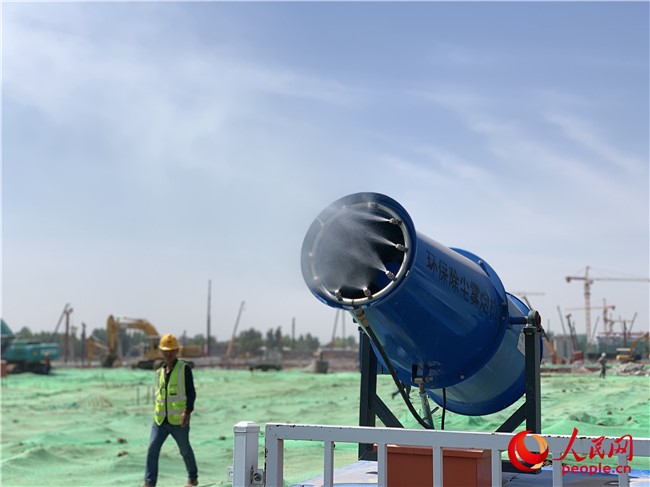 環(huán)保除塵霧炮機在施工現(xiàn)場作業(yè)。人民網(wǎng)5月7日攝