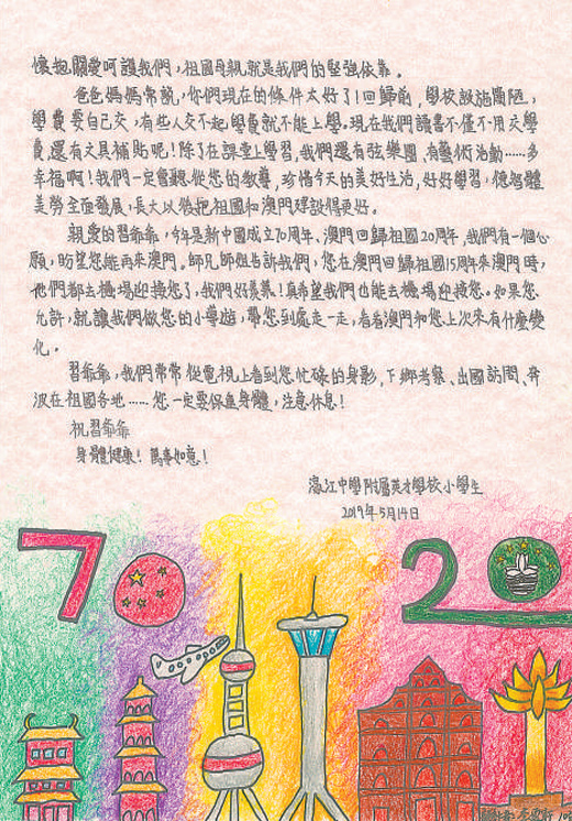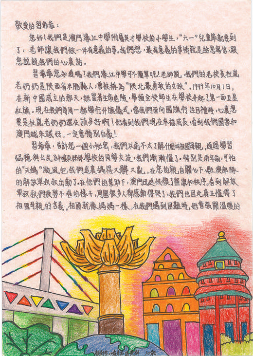 濠江中學創(chuàng)建于1932年,以愛國愛澳、為社會培育人才為辦學宗旨,是澳門中小學生人數(shù)最多的學校。該校素有愛國主義傳統(tǒng),1949年10月1日新中國剛剛成立,時任校長杜嵐就帶領(lǐng)學校師生升起了第一面五星紅旗。近日,濠江中學附屬英才學校的小學生給習主席寫信,講述了他們對“祖國母親”含義的理解,表達了長大后把祖國和澳門建設(shè)得更美好的決心。