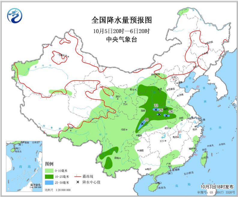 10月5日20時至6日20時,西藏東部、西北地區(qū)中東部、華北中西部、黃淮西部、江漢西部、西南地區(qū)大部、華南中南部、臺灣島等地的部分地區(qū)有小到中雨,陜西南部、河南南部和西部、四川盆地東北部等地局地有大雨(25~40毫米)。江西北部部分地區(qū)有5~6級風(見圖5)。
