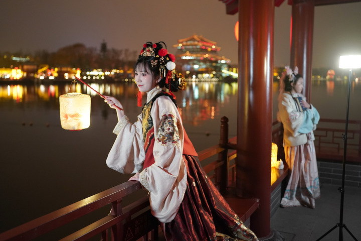 2024年2月2日,游客在西安大唐芙蓉園拍照游玩。新華社記者 邵瑞 攝