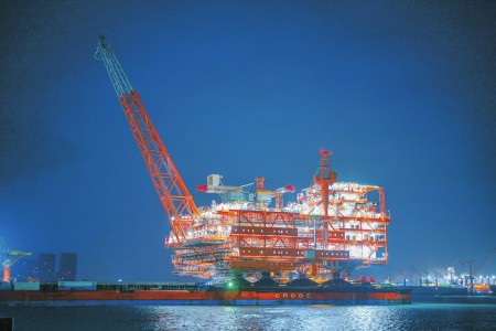圖為11月14日清晨在山東青島拍攝的渤中26-6油田一期開發(fā)項(xiàng)目中心平臺(tái)裝船作業(yè)現(xiàn)場。當(dāng)日,全球最大變質(zhì)巖油田渤中26-6油田一期開發(fā)項(xiàng)目中心平臺(tái)在山東青島完成裝船作業(yè),后續(xù)將赴渤海南部海域,進(jìn)入海上安裝和聯(lián)調(diào)階段,這標(biāo)志著該項(xiàng)目陸地建造完工。