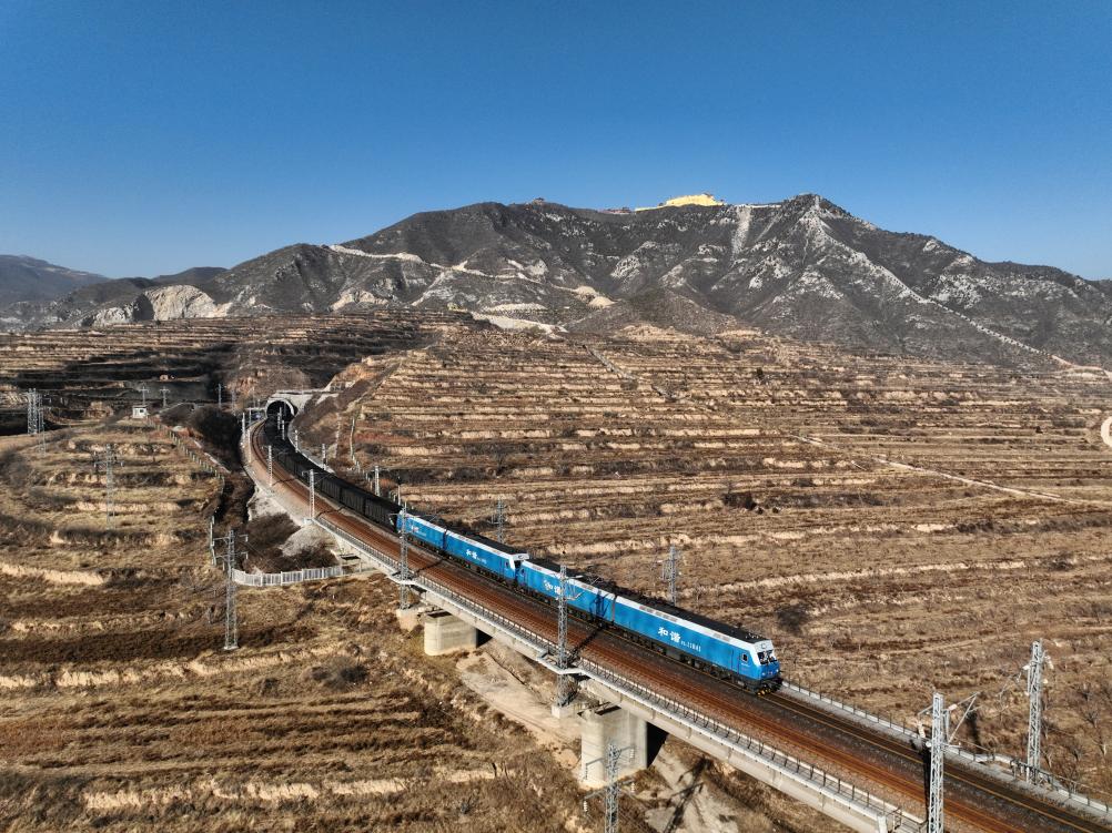 春運(yùn)期間,重載列車在瓦日線上馳騁,為華東沿海港口及能源需求腹地運(yùn)送煤炭等能源物資。 新華社發(fā)(張睿攝)