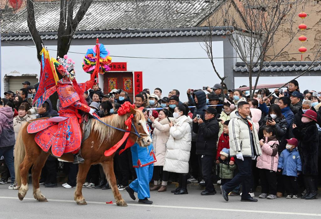 2月12日,游客在隴縣元宵節(jié)社火巡游活動(dòng)上觀看馬社火表演。 新華社記者 鄒競(jìng)一 攝