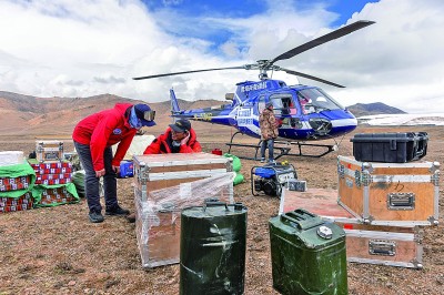 科考團(tuán)隊(duì)用直升機(jī)將科考物資運(yùn)往海拔6100米的冰原,以進(jìn)行冰芯鉆取工作。新華社發(fā)