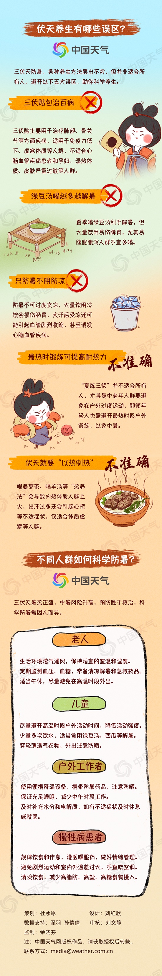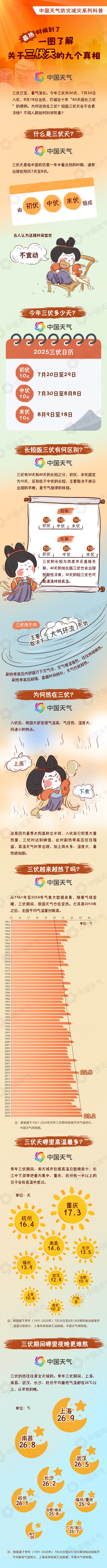 今天(7月20日),我國(guó)正式入伏,意味著一年中最熱的時(shí)候來了。今年為30天短版三伏,打破了近十年“40天超長(zhǎng)三伏”的慣例。為何說熱在三伏?短板三伏天會(huì)不會(huì)更涼快?不同人群如何科學(xué)防暑?中國(guó)天氣網(wǎng)推出防災(zāi)減災(zāi)系列科普,一圖了解關(guān)于三伏天的9個(gè)真相。
