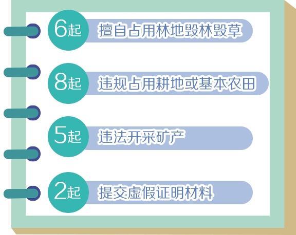 有5起違法開采礦產(chǎn):包括河南省南陽市南召縣達(dá)康實(shí)業(yè)發(fā)展有限公司以設(shè)施農(nóng)業(yè)為名違法開采砂石37萬噸;廣西壯族自治區(qū)北流市委、市政府主導(dǎo)推動以工程建設(shè)項(xiàng)目施工名義違法開采砂石土等。另有2起提交虛假證明材料等違法違規(guī)行為。