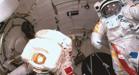 北京航天飛行控制中心屏幕拍攝的航天員艙內(nèi)工作畫(huà)面。