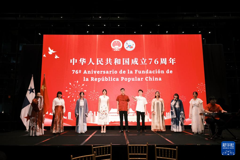 9月22日,在巴拿馬首都巴拿馬城,當?shù)厍嗄暝趹c祝中華人民共和國成立76周年招待會上合唱中文歌曲。新華社記者 許詠政 攝