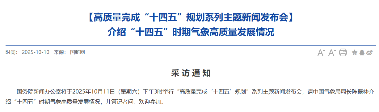 國務(wù)院新聞辦公室將于2025年10月11日(星期六)下午3時(shí)舉行“高質(zhì)量完成‘十四五’規(guī)劃”系列主題新聞發(fā)布會,請中國氣象局局長陳振林介紹“十四五”時(shí)期氣象高質(zhì)量發(fā)展情況,并答記者問。
