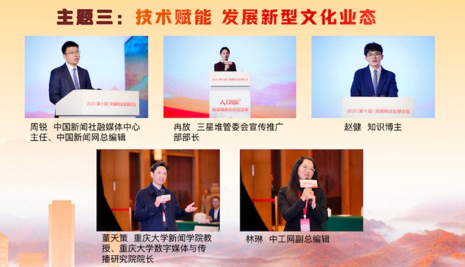 在“技術(shù)賦能 發(fā)展新型文化業(yè)態(tài)”主題研討環(huán)節(jié),中國新聞社融媒體中心主任、中國新聞網(wǎng)總編輯周銳,三星堆管委會宣傳推廣部部長冉放,知識博主趙健,分別就技術(shù)賦能中華文化“破圈”出海、三星堆文化傳播數(shù)智實踐、短視頻文化傳播等方面的經(jīng)驗成果進行了精彩展示。重慶大學(xué)新聞學(xué)院教授、重慶大學(xué)數(shù)字媒體與傳播研究院院長董天策,中工網(wǎng)副總編輯林琳作為互動嘉賓進行了點評,期待主流媒體發(fā)揮傳播實踐智慧,在內(nèi)容、技術(shù)和社會責(zé)任之間找到平衡,鑄造中華文化新輝煌。