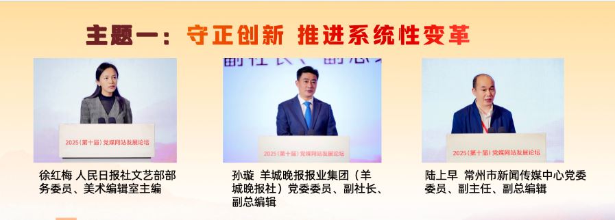 在“守正創(chuàng)新 推進系統(tǒng)性變革”主題研討環(huán)節(jié),人民日報社文藝部部務(wù)委員、美術(shù)編輯室主編徐紅梅,羊城晚報報業(yè)集團(羊城晚報社)黨委委員、副社長、副總編輯孫璇,常州市新聞傳媒中心黨委委員、副主任、副總編輯陸上早分別作主旨發(fā)言,介紹了各自領(lǐng)域推進系統(tǒng)性變革、發(fā)展新時代中國特色社會主義文化的實踐與探索。徐紅梅表示,“每日讀畫”采取“AI+美術(shù)”“微視頻+夜讀”的形式,堅持“讀準(zhǔn)、讀細、讀新、讀美”,讓AI成為深入畫境、開啟古今對話的共創(chuàng)者,以動態(tài)轉(zhuǎn)譯、意境擴展、流程再造、視聽融合開發(fā)美術(shù)融媒的敘事潛能,深入挖掘中華文明賡續(xù)傳承的基因密碼,成為探索主流媒體系統(tǒng)性變革的微觀樣本。孫璇表示,羊城晚報全面啟動系統(tǒng)性變革,以做強媒體、文化、數(shù)據(jù)、產(chǎn)業(yè)四個戰(zhàn)略板塊為重點,把“技術(shù)賦能”嵌入系統(tǒng)性變革各關(guān)鍵板塊,積極增強文化傳播、促進文化交流和繁榮文化生產(chǎn)。陸上早表示,常州借“蘇超”東風(fēng),走出城市轉(zhuǎn)型與能級躍升之路。改革的推進需聚焦六大方向:組織體系化,內(nèi)容精品化,傳播移動化,技術(shù)現(xiàn)代化,分配績效化,干部年輕化。
