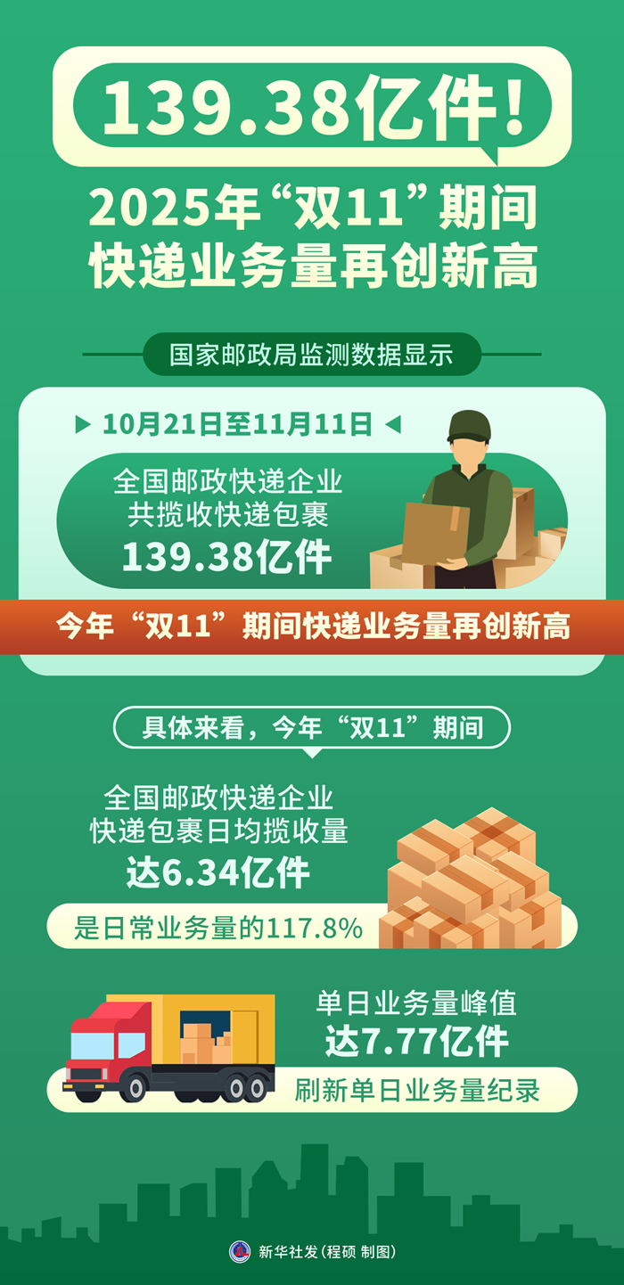 新華社北京11月12日電(記者葉昊鳴)記者11月12日從國(guó)家郵政局獲悉,國(guó)家郵政局監(jiān)測(cè)數(shù)據(jù)顯示,10月21日至11月11日,全國(guó)郵政快遞企業(yè)共攬收快遞包裹139.38億件,今年“雙11”期間快遞業(yè)務(wù)量再創(chuàng)新高。